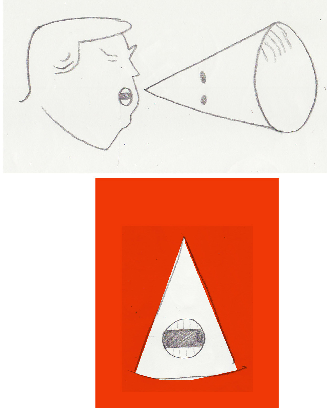 Here were a couple of quick doodles based on the distinctive KKK hood. The megaphone sketch was a hit with cover designer Graeme James, and the editorial team.